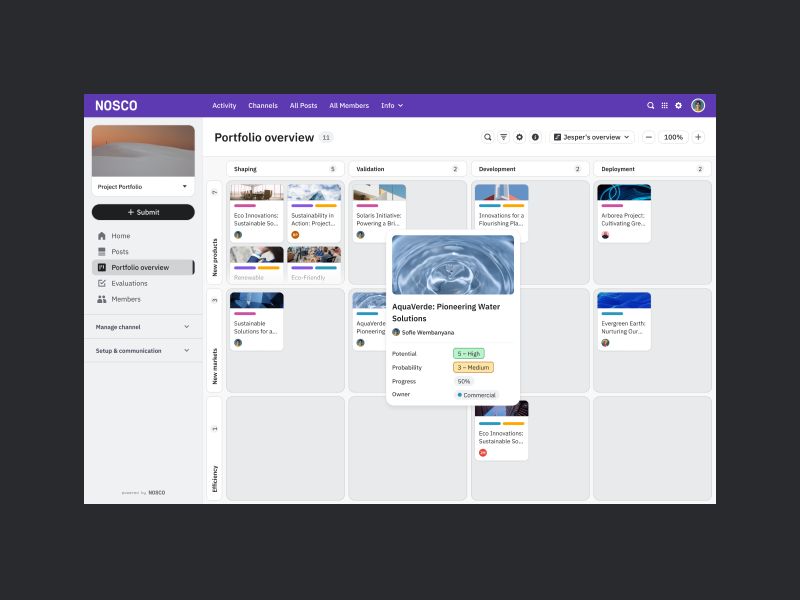 - Holistic Approach: The Innovation Management System is fully supported by the Nosco platform and includes cultural aspects such as the importance of employee engagement, practices (training), and balanced portfolio management.